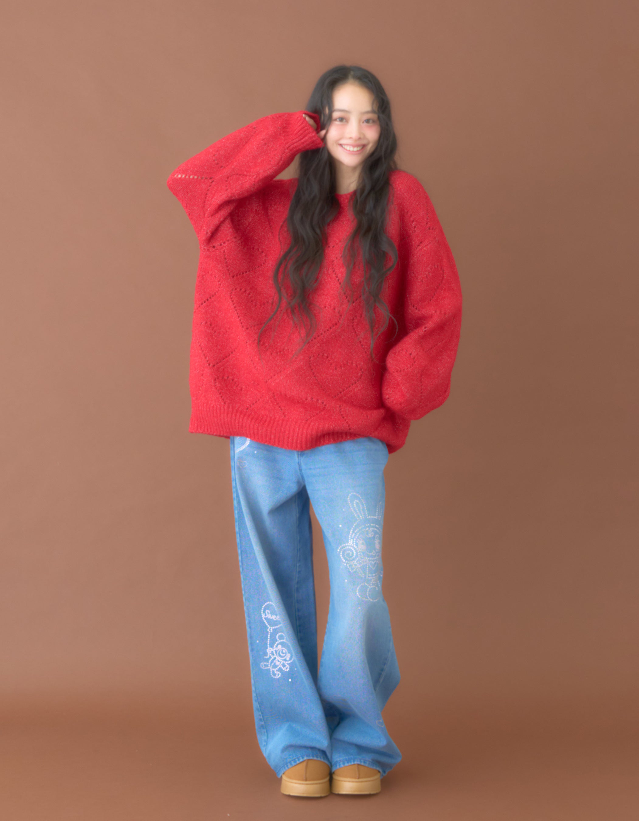 動くたびキラキラ光るベリエちゃんのストーンが装飾が、シンプルなデニムに華やかさとガーリーなムードをプラス。ゆったりとしたシルエットで履き心地も抜群。
