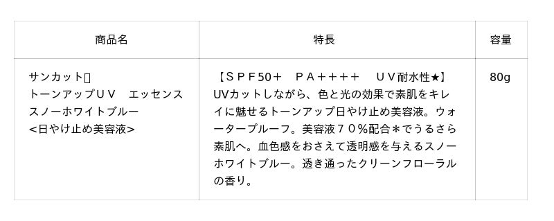 近年、色補正効果の高いカラー下地の需要は大変高まっています。特にブルー系のカラー下地は、透明感やトーンアップ効果に優れていることから根強い人気を集めています。日やけ止め市場においても、トーンアップタイプは、肌をきれいに見せて化粧下地としても使えるアイテムとして存在感を高めています。このような背景から『サンカット(R)』よりブルーカラーのトーンアップUVエッセンスを発売します。