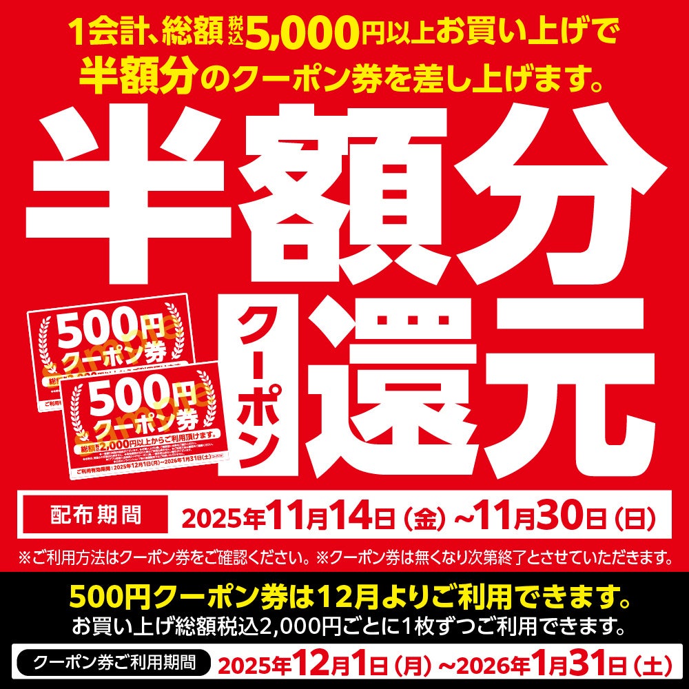※クーポン券は12月1日(月)より、お買い上げ総額2,000円(税込)ごとに1枚(500円分)ずつご利用いただけます。