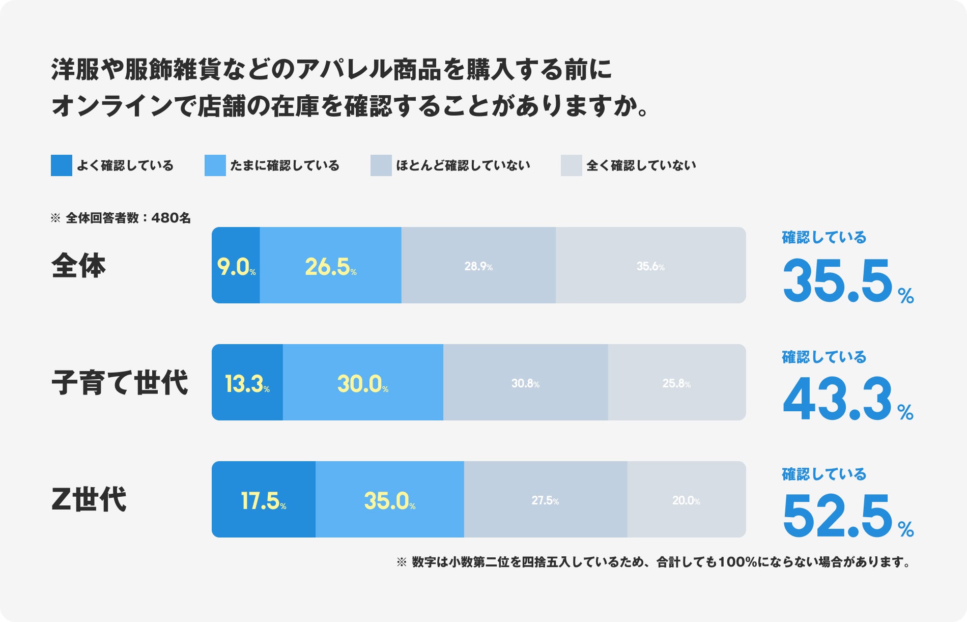「洋服や服飾雑貨などのアパレル商品を購入する前にオンラインで店舗の在庫確認をすることがありますか?」という質問に対し、「確認する」と回答した人は全体で35.5%と、約3人に1人が事前に店舗在庫の確認をすることが分かりました。年代別では20代以下の女性が57.5%で最も高く、次いで30代男性が53.8%となりました。世代別では、子育て世代(中学生以下の子どもを持つ親・男女)の43.3%、Z世代(高校生・大学生の男女)の52.5%が「確認する」と回答しました。さらに、事前にオンラインで在庫確認をする人の内「オンラインで在庫確認をした後、店舗で商品を購入した経験がある人」は全体で58.1%と6割近くおり、中でも子育て世代の男性30代が最も高い78.9%という結果となりました。