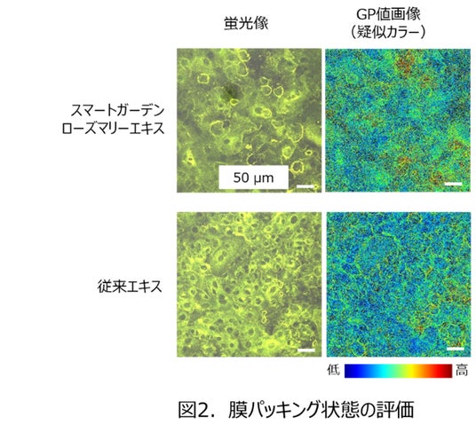 蛍光像の観察から、スマートガーデンローズマリーエキスを添加した細胞は、従来エキスよりも細胞が大きくなり、細胞膜に相当する外側部分が明瞭である様子が確認できました。さらにGP値も高いことから、スマートガーデンローズマリーエキスを添加した細胞でCEの成熟度が高いことが示されました(図2)。