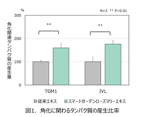 正常ヒト表皮角化細胞にスマートガーデンローズマリーエキスと従来のローズマリーエキスを添加し、角化に関わるタンパク質として知られているトランスグルタミナーゼ1(TGM1)、およびインボルクリン(IVL)の産生量を比較しました。その結果、スマートガーデンローズマリーエキスの方が、TGM1 と IVLの産生量を増加させることが明らかとなりました(図1)。