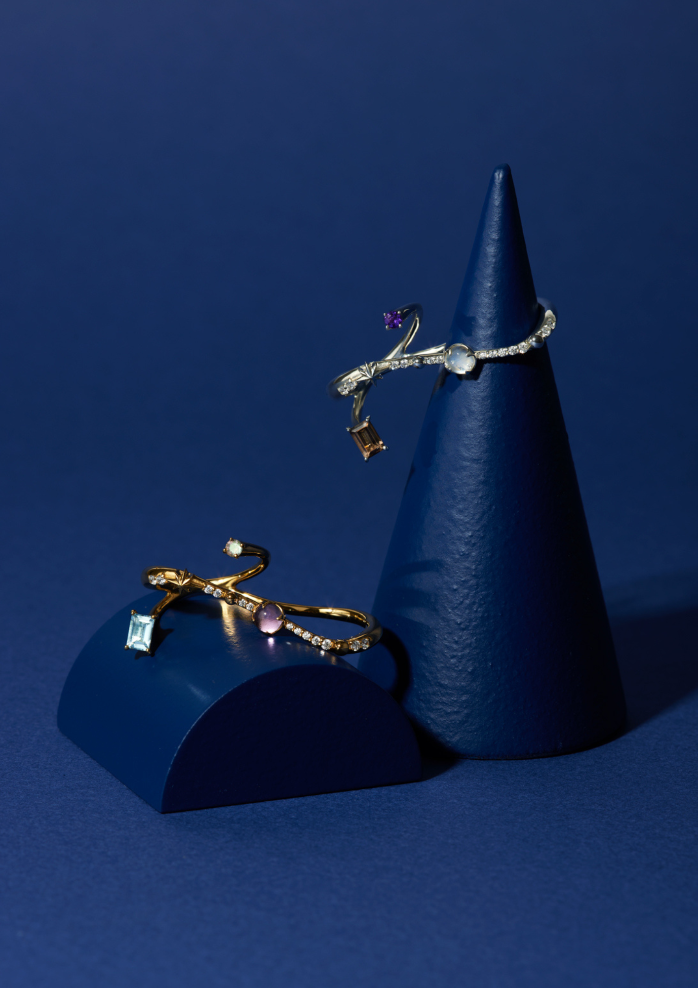 2025年ホリデー限定の新作は、宇宙船が互いに速度を合わせ同じ軌道上で接近するドラマティックな瞬間「Rendez vous(ランデヴー)」からインスパイアされた、ダブルフィンガーリング。