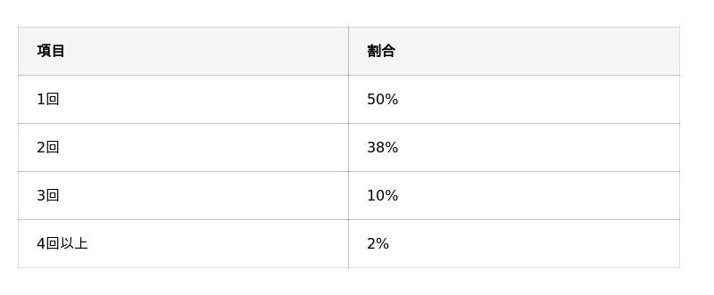さらに、「1回」または「2回」と答えた人が全体の88%を占めており、今回の調査では、多くの方が少ない回数で施術を終えている傾向が見られました。
