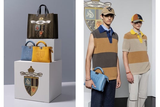 「フェンディ クレスト」は、ダブルブレストブレザーやポロシャツへの刺繍、編み込みカシミアニットのパッチとして表現され、シルクやコットンシャツでは幾何学的なモチーフとしてデザインされ、レディ・トゥ・ウェアからアクセサリーまで幅広く展開いたします。ダークグリーンの「ペカン」ストライプを配したキャンバス製トートバッグの中央には、メゾンのコードを細部まで表現した「フェンディ クレスト」の大きなパッチを施し、キャップやレジメンタルスタイルのネクタイにもこの紋章が飾られています。