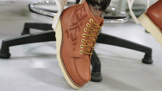 それぞれの世界の強みを最大限に生かし、しなやかな「クオイオ ローマ(Cuoio Romano)」レザーと「セレリア(Selleria)」のハンドステッチに加え、シエナレッドとナチュラルベージュといったフェンディのカラーパレットが、1952年以来レッドウィングのアイコンであり続けている「クラシック モック」ブーツのシルエットに用いられています。今シーズン、ブーツは文字通りフェンディコレクションの足元を固めます。
