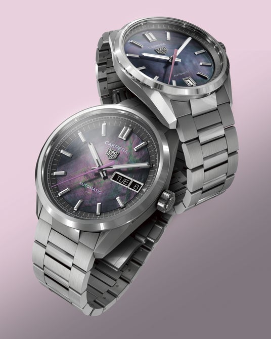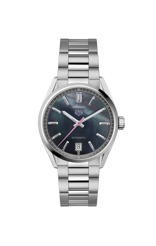 天然素材ならではの表情を持つブラックマザーオブパールは、光の角度によって深みと透明感を自在に変化させ、ダイヤルに豊かな奥行きをもたらします。そこに配されたピンクカラーの針が、控えめでありながら確かな存在感を放ち、全体の調和を完成させています。ロジウムプレート仕上げのファセット加工インデックスと、ホワイトのスーパールミノバ(R)を施した針が、洗練された美しさと高い視認性を両立。タグ・ホイヤー カレラのタイムレスなデザインに、このモデルのためだけに仕立てられた特別なニュアンスを加えています。