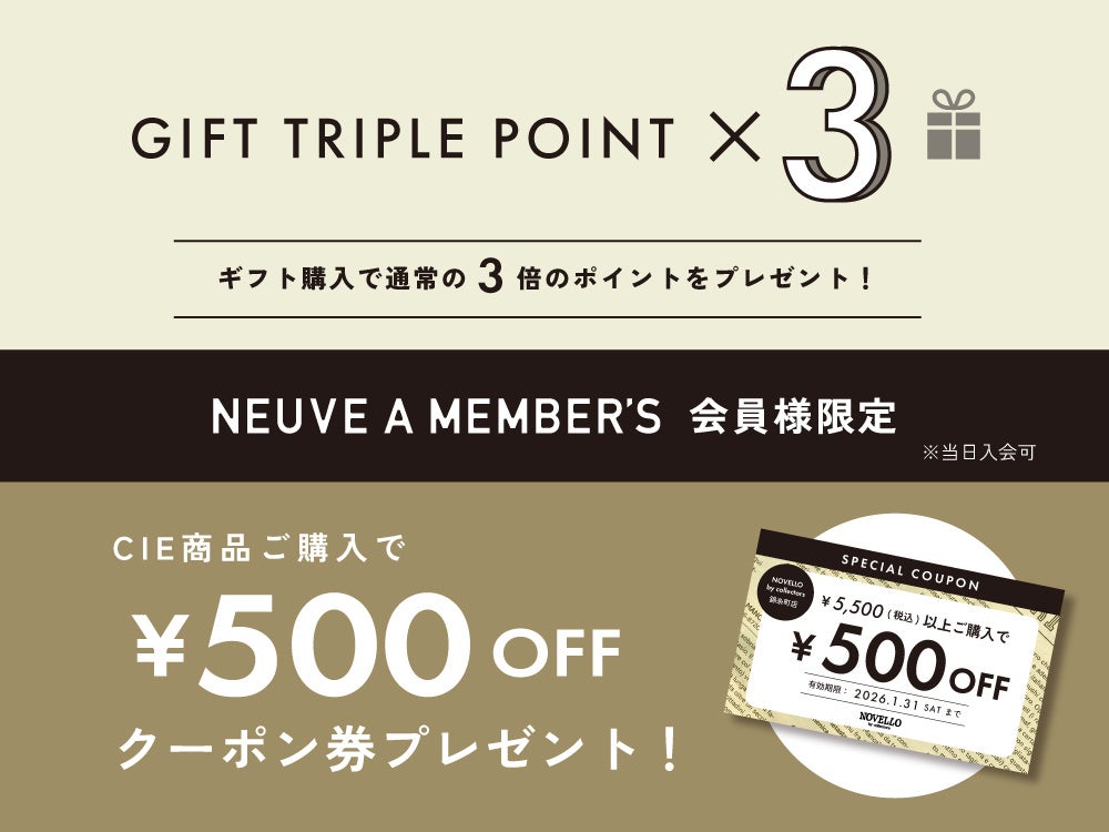 また、COLLECTORSを運営する株式会社ヌーヴ・エイの無料会員サービス『NEUVE A MEMBER'S』にご入会いただいている方を対象に、「ギフトのご購入でトリプルポイント進呈」や「NOVELLO by collectors錦糸町店で使えるクーポンプレゼント」を同時開催。