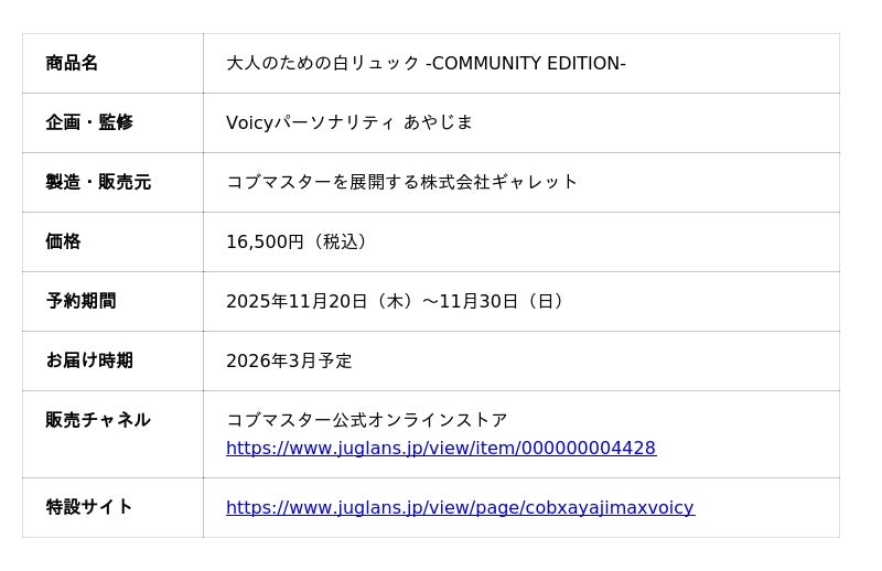 株式会社Voicy(本社:東京都渋谷区、代表取締役:緒方 憲太郎)は、音声プラットフォームVoicyで活躍する人気パーソナリティのあやじまさんと、アウトドアライフスタイルブランド「コブマスター」とのトリプルネームによるコラボレーションリュック「大人のための白リュック -COMMUNITY EDITION-」が、コブマスターより予約販売を開始されることをお知らせします。