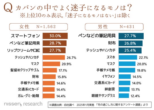 カバンの中で迷子になるモノ1位は、スマホ。2位ペン。3位リップクリーム。