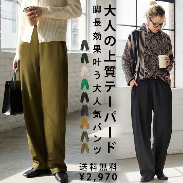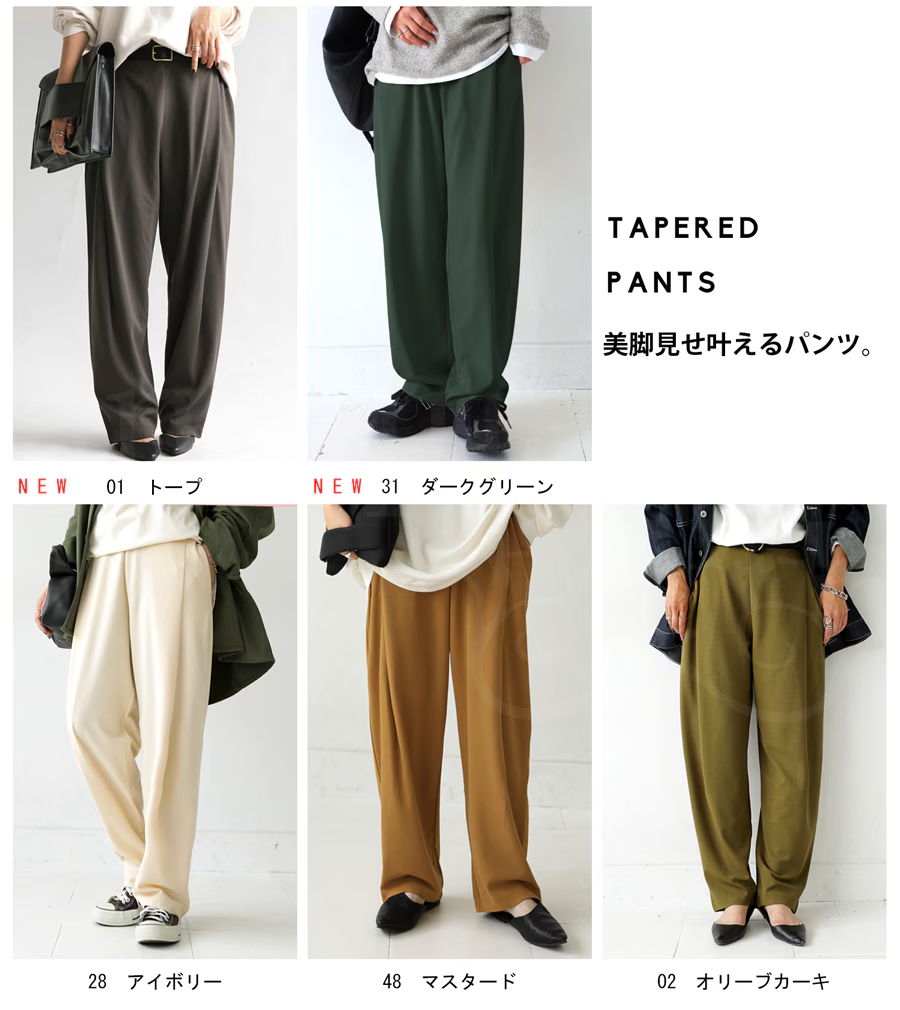 美脚シルエットと快適な伸縮性で人気を集め続けるantiquaのテーパードパンツ。