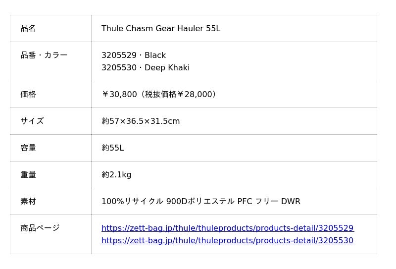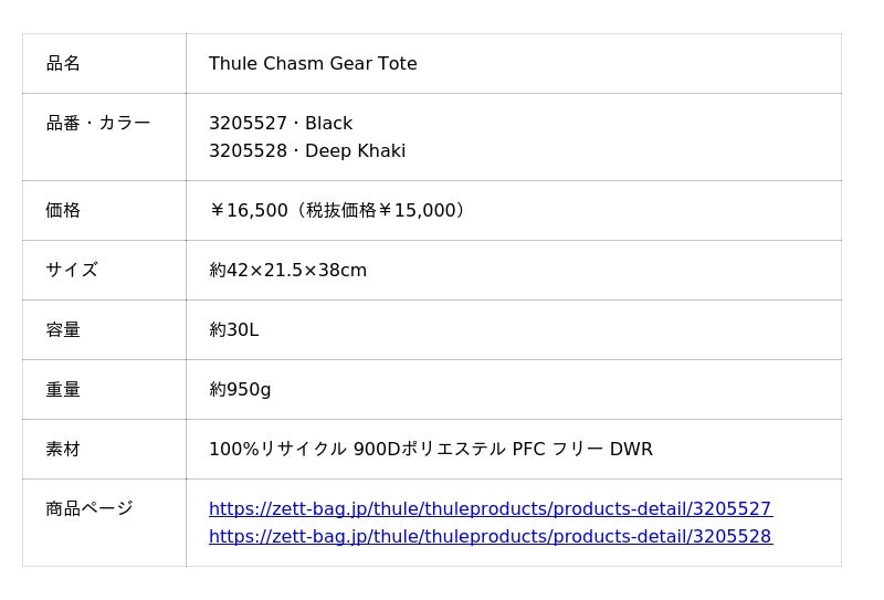 ゼット株式会社(本社/大阪市天王寺区、代表取締役社長/渡辺裕之)が取り扱うスウェーデンのブランド 『THULE』(スーリー)は、タフな冒険のための堅牢スタイリッシュなラゲッジコレクション【Thule Chasm (スーリー キャズム)】から、キャンプギア収納にも最適なソフトコンテナ2サイズとトートバッグを各2色で2026年4月に発売しました。