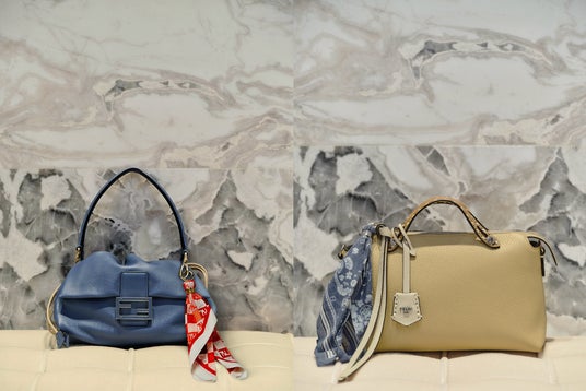 左:「マンマ バゲット」バッグ ミディアム ¥492,800(H18×W26.5×D8.5cm)、チャーム(バンダナ)¥40,700 / 右:「バイ ザ ウェイ」バッグ ¥404,800、チャーム(バンダナ)¥40,700(すべて税込み価格・5月上旬発売予定)