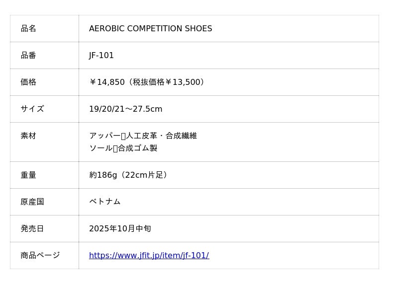 ゼット株式会社(本社/大阪市天王寺区、代表取締役社長/渡辺裕之)のオリジナルブランド『JFIT』(ジェイフィット)から、競技エアロビック専用シューズとして【AEROBIC COMPETITION SHOES JF-101】が2025年10月中旬に発売しました。