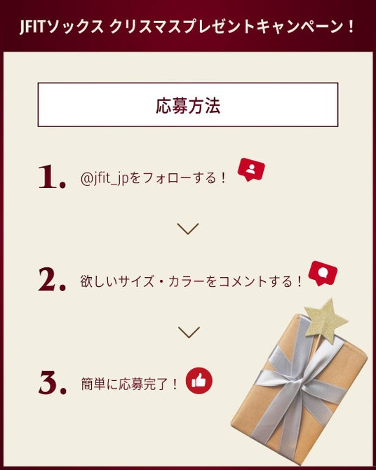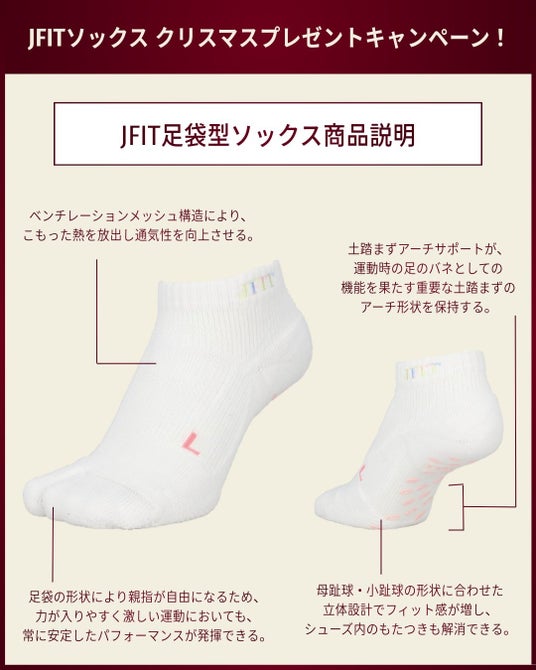 ゼット株式会社(本社/大阪市天王寺区、代表取締役社長/渡辺裕之)のオリジナルブランド『JFIT(ジェイフィット)』の公式インスタグラムアカウント(https://www.instagram.com/jfit_jp/)にて、2025年11月28日(金)~12月15日(月)の期間中、人気の足袋型ソックス【JF-SOX8】(8cm丈)が抽選で当たるクリスマスキャンペーンを開催中です。