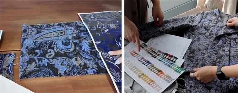 デザイナーが尾州の工場を実際に訪れ、 機械音が響く工場の中で、熟練の職人たちが糸と向き合う姿を目にし、 「この土地でしか生まれない布」を直感。 理想の柄と色合いを追求するため、糸選び・配色・織りの密度を幾度も調整。