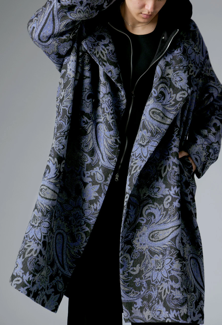 世界三大毛織物産地「尾州(BISHU)」の伝統を受け継いだ、日本製のウール100%ロングコート。高密度のジャガード織で立体的に表現されたオリジナルのペイズリー柄が、上質な存在感を放ちます。