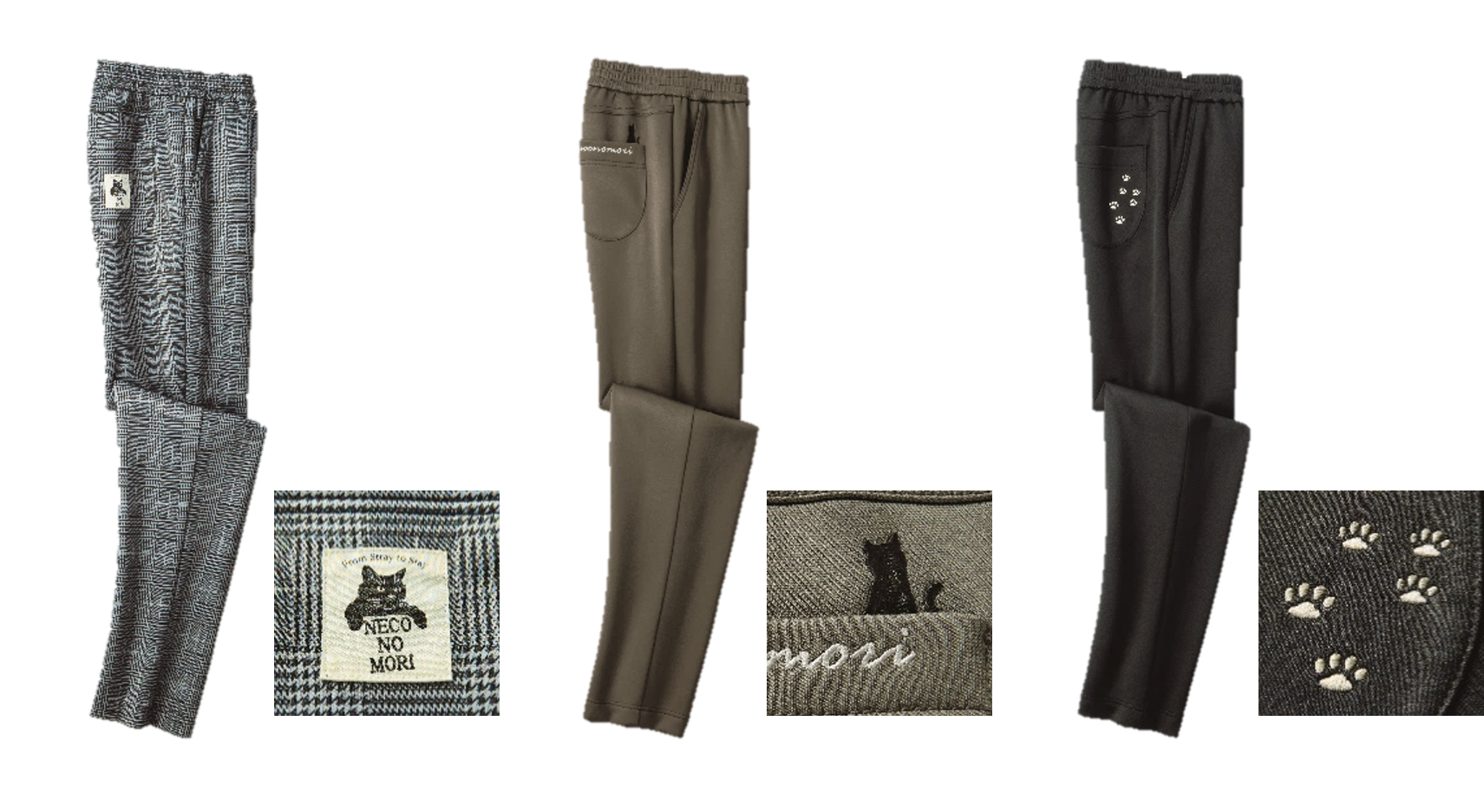 特長 :毎日使いやすい裏起毛パンツです。よく伸びて快適な着心地ながら、スッキリとしたシルエットを実現。ポケットには、さりげないアクセントとしてかわいい猫のモチーフをあしらいました。3色ともそれぞれデザインが異なり、コーディネートの楽しみも広がります。