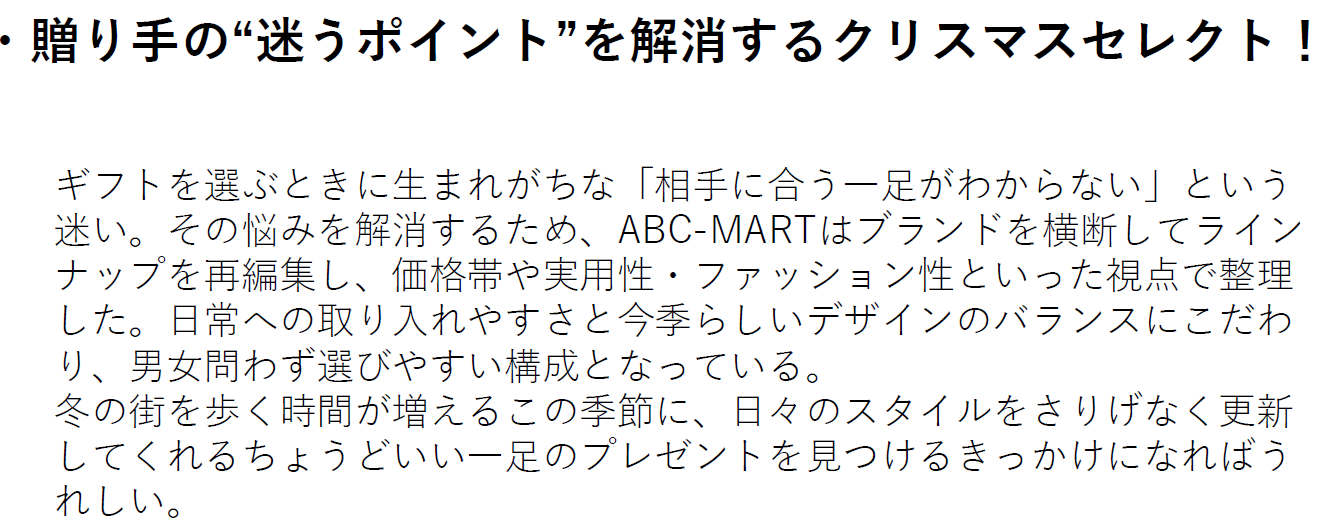 街のイルミネーションがきらめく季節――。今年のクリスマスギフトは、「実用性も気持ちもちゃんと届くもの」を選びたい。ABC-MARTでは、『相手にぴったりが見つかる』スニーカー特集を公開。人気モデルから冬コーデに合わせやすい定番、ウォーキングやランニングなど“ライフスタイルに寄り添う一足”まで、幅広くラインナップしました。「何を選べばいいかわからない…」という人でも安心。外さず喜ばれる『冬ギフト』を、今年はスニーカーから選んでみませんか?
