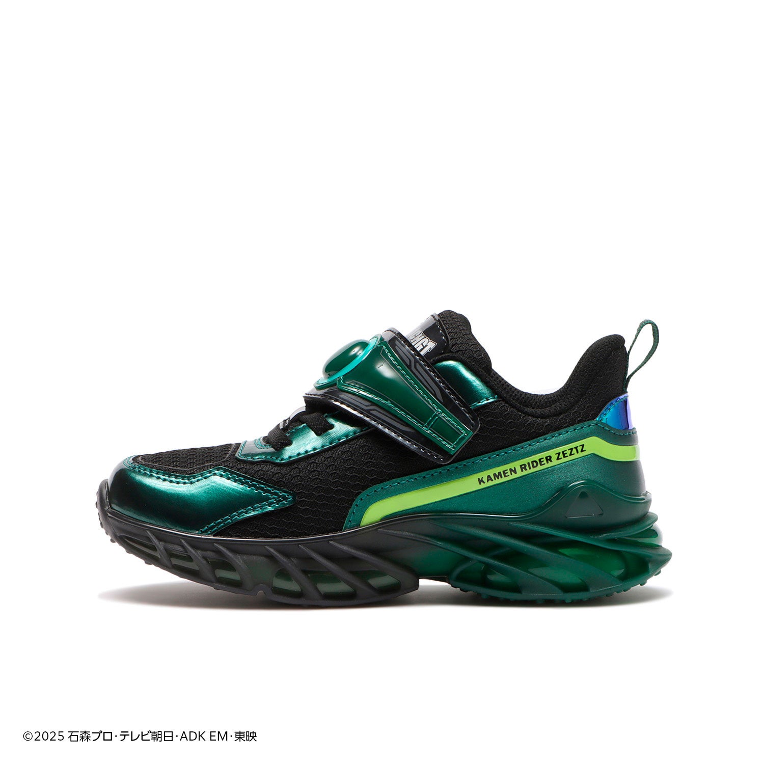 仮面ライダー史上初となる、“胸に巻く変身ベルト”「ゼッツドライバー」をモチーフに、シューズベルトをななめに取り付けた本商品は、歩くたびに振動によってベルト部分が光る仕掛けが施されています。アウトソールには近未来感を演出するクリアパーツを採用し、アッパー部分には仮面ライダーの特徴的な六角形柄のスーツをイメージしたメッシュ素材を使用しています。インソールにも仮面ライダーゼッツをプリントし、履くときに靴の左右がわかりやすい仕様になっています。カラーはフォームチェンジをイメージした全4色展開です。