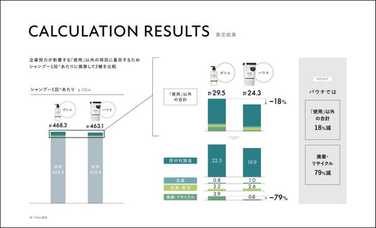 - シャンプー1回あたりの「使用」段階におけるCO2排出量はボトル製品・詰替えパウチ製品で同一。それ以外のライフサイクルでの比較では、詰替えパウチ製品の方がCO2排出量が18% 減、「廃棄・リサイクル」段階では79%減