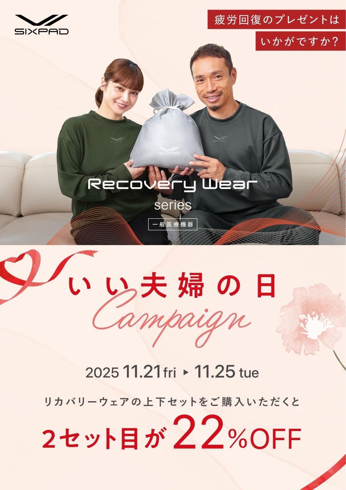 そして11月22日の「いい夫婦の日」を記念し、11月21日より「いい夫婦の日キャンペーン」を開催いたします。SIXPAD STORE(シックスパッド ストア)店頭にてリカバリーウェアの上下セットを2セットご購入いただくと、2セット目が22%OFFになる特別割引です。