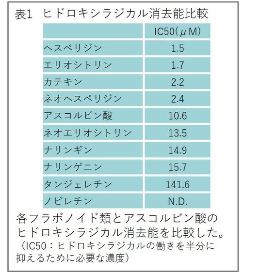 そこで、数多くあるフラボノイドの中から、ヒドロキシラジカルを効果的に除去できるものを見つけるために、発生させたヒドロキシラジカルを各フラボノイドと混合し、ラジカルがどれだけ減少するか測定する試験を実施し、比較研究を行いました(表1)。