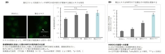 複合エキスは、添加なしと比べて、有意にNRF2の核内移行が促進されていることが明らかとなりました(図5)。