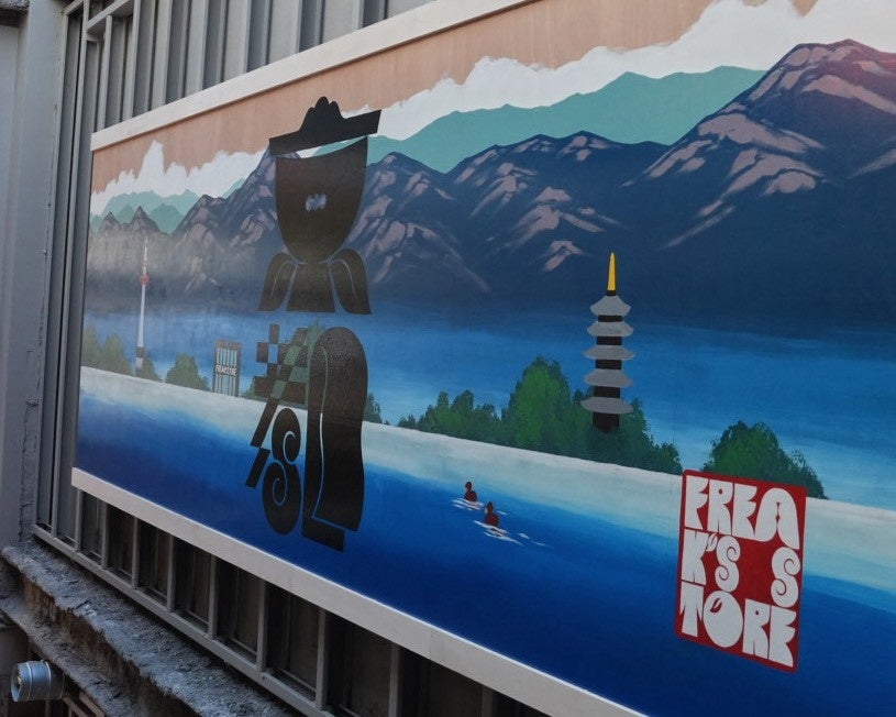 美術大学を卒業後、銭湯ペンキ絵師・田中みずき氏のもとで経験を積み、現在は独立して活動。銭湯の壁を中心に、山のある風景を描き続けています。今回の作品では、京都の自然とFREAK’S STORE京都のロゴを融合させた風景が描かれています。