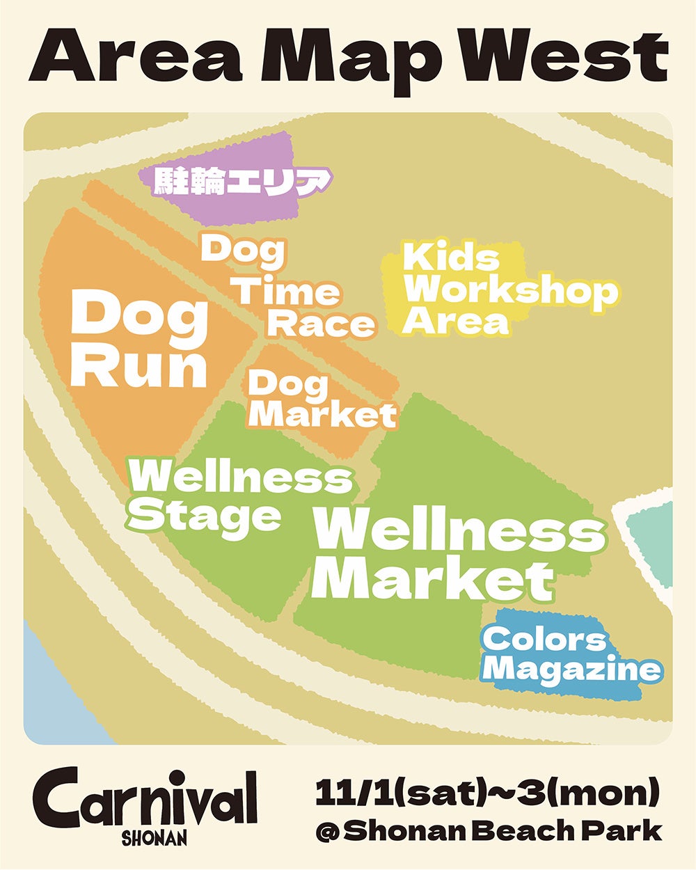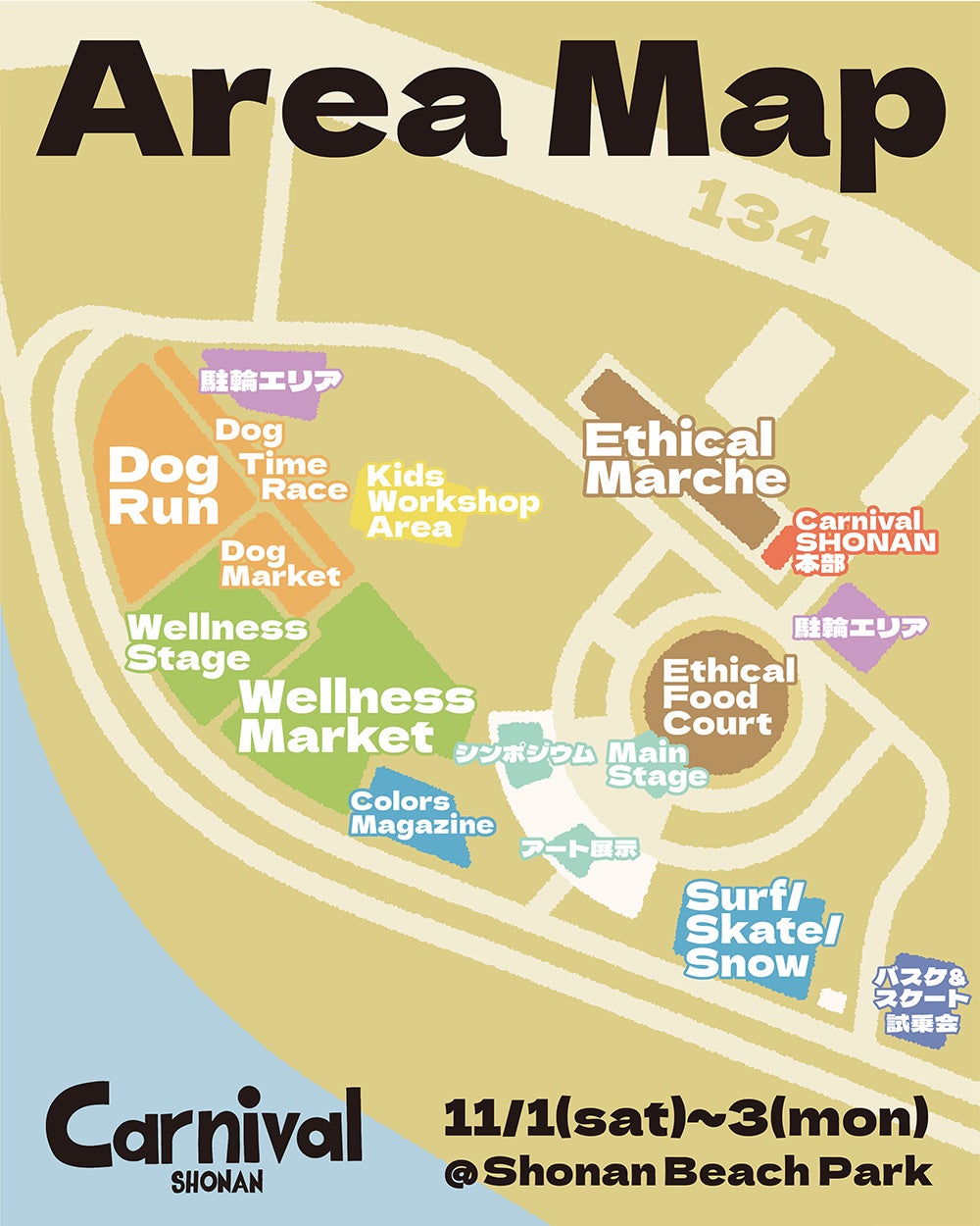 「エシカルフードコート」「エシカルマルシェ」「ウェルネスエリア」「サーフ/スケート/スノーエリア&カラーズマガジンエリア」合わせて120を超える出店者様に加えて今年はドッグエリアも初登場です!約1500平方メートル のドッグラン&ドッグタイムレースエリアが登場します。そして11/1.2の夜は映画祭も開催します。更にパワーアップした"カーニバル湘南"へ是非ご来場ください!