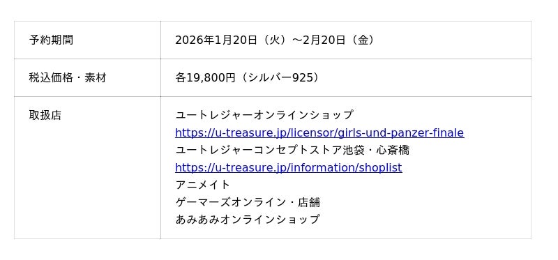 株式会社ユートレジャー(本社:東京都新宿区、代表取締役社長:青木 興一、株式会社ケイ・ウノの連結子会社)は、【ガールズ&パンツァー 最終章】とコラボレーションした「履帯モチーフリング(指輪)」の予約受け付けを2026年1月20日(火)~2月20日(金)の期間、ユートレジャーオンラインショップ、ユートレジャーコンセプトストア池袋・心斎橋にて行います。ユートレジャーでは初めての取り扱いライセンスとなります。