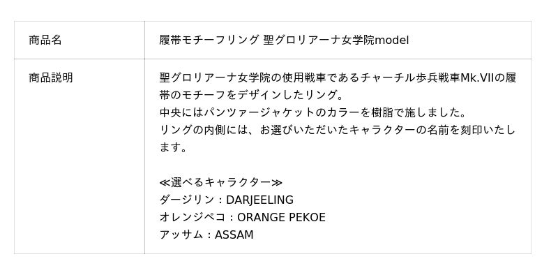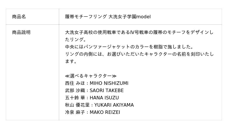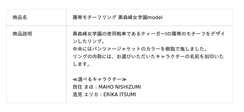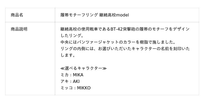 このたびの新作は履帯のモチーフをデザインしたリング(指輪)です。パンツァージャケットのカラーを樹脂で施し、内側にキャラクターの名前を刻印します。