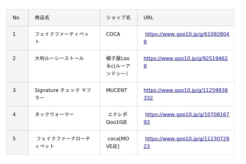 Qoo10(https://www.qoo10.jp/)サイト上、「マフラー」カテゴリーの各販売個数に基づいたランキングです。