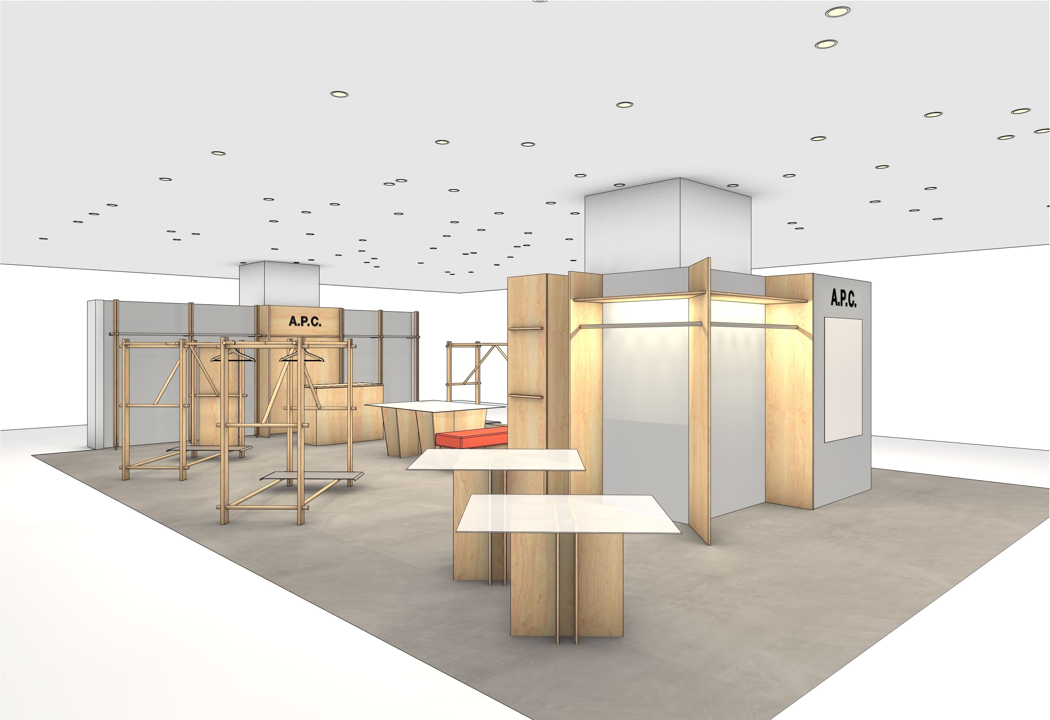 A.P.C. DAIMARU SAPPORO は、ローラン・ドゥロー・アーキテクツがデザイン監修を行い、木材とステンレスを基調に、塗装や乳白色のガラスをアクセントとして取り入れ、札幌の冬を思わせるイメージを表現しています。 これらの要素にシンプルな木製什器を組み合わせることで、A.P.C.のミニマルでクリーンな美学を表現しています。