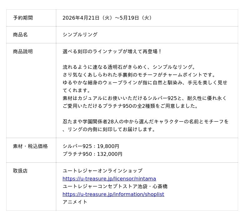 株式会社ユートレジャー(本社:東京都新宿区、代表取締役社長:青木 興一、株式会社ケイ・ウノの連結子会社)は、尼子騒兵衛による漫画「落第忍者乱太郎」が原作のTVアニメ「忍たま乱太郎」とコラボレーションした「シンプルリング(指輪)」の選べる刻印のラインナップを追加し、2026年4月21日(火)~5月19日(火)の期間、ユートレジャーオンラインショップ、ユートレジャーコンセプトストア池袋・心斎橋にて予約受付を行います。