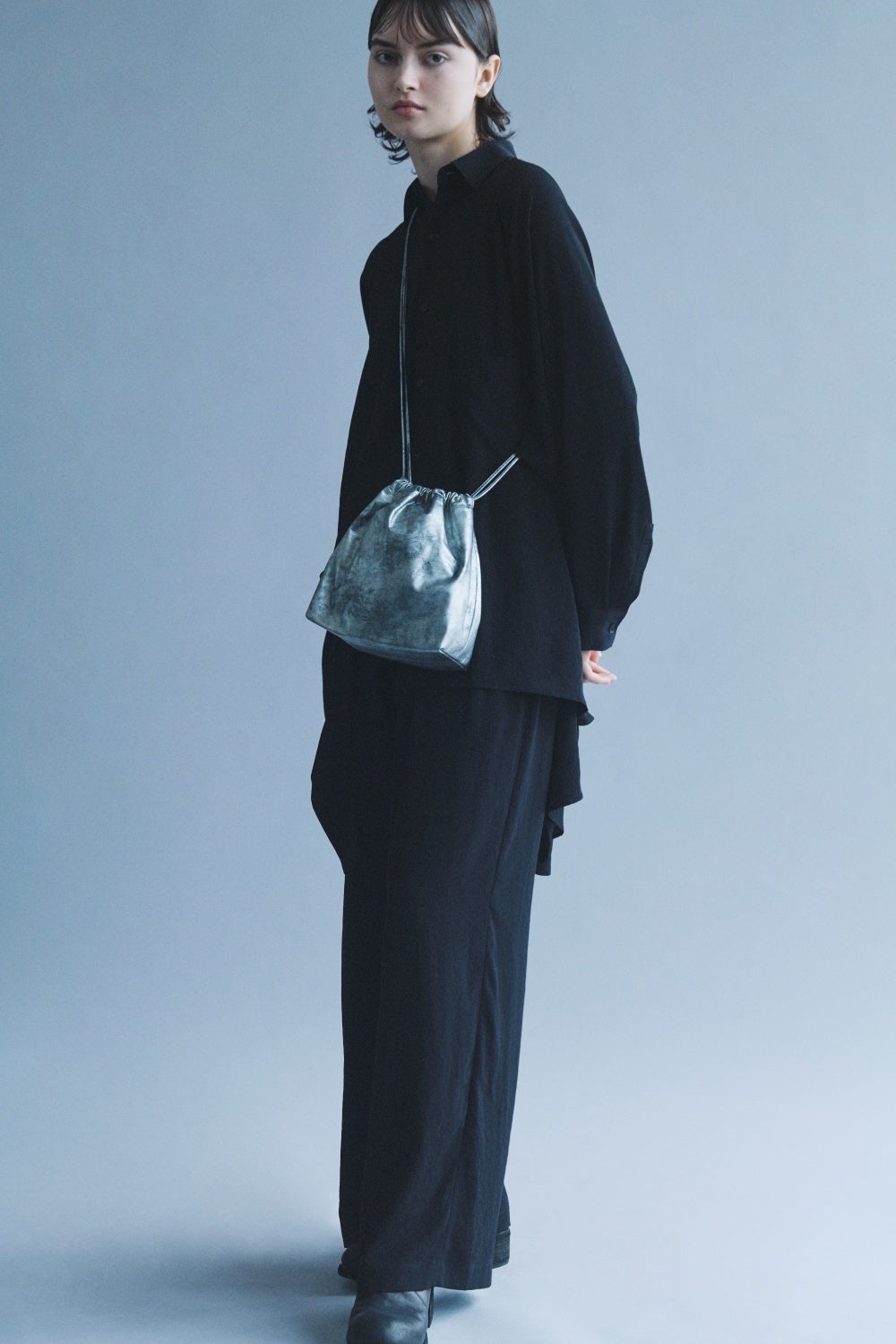 同じくドローストリングがショルダーストラップになった、ミニマルなショルダーバッグ。外側と内側にポケットを備え、コンパクトなサイズながら必要なものをすっきりと収められるつくりです。ストラップは長さの調整が可能で、控えめなディテールが全体に穏やかな表情を添えます。箔を施した柔らかく上品なレザーを生かし、光の角度で微かに表情を変える質感が魅力の一点です。
