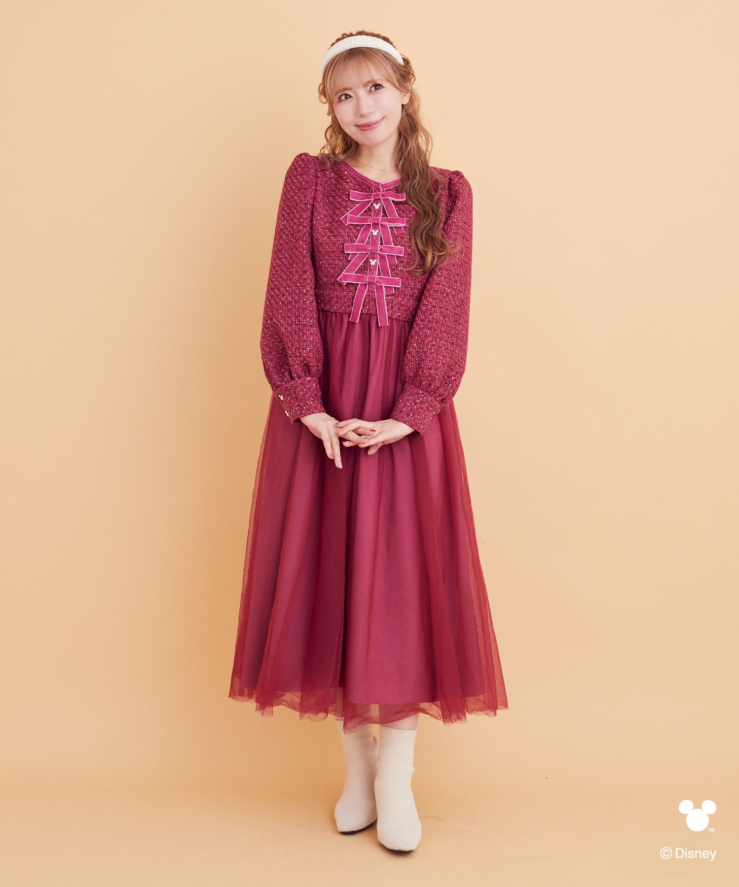 きらめくスパンコール付きのツイード生地に程よいボリューム感のチュールをドッキングしたワンピースは、一枚でコーディネートが完成するとっておきのデザイン。フロントにあしらった4つのベロアリボンとパフスリーブが、レトロで上品な魅力を引き出します。