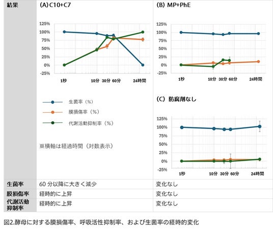 C7とC10の併用による抗菌メカニズムを解明するため、代表的な真菌である酵母の一種Candida albicansを対象に、保存効力試験の過程における細胞膜の損傷度と代謝活動(呼吸活性)の抑制率を評価しました(図2)。