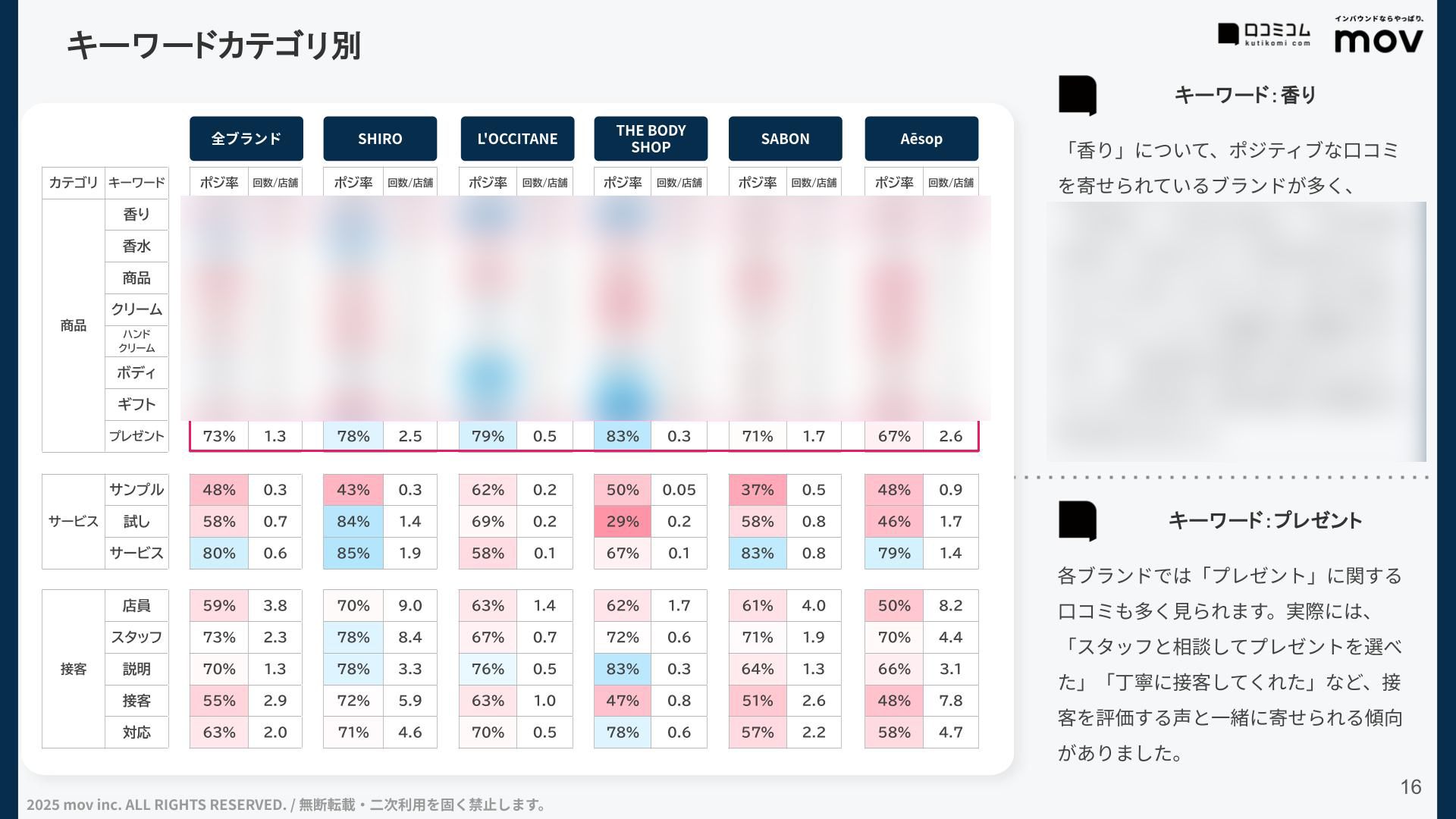 各ブランドでは「香り」「プレゼント」に関する口コミが多く見られました。キーワード「プレゼント」で実際に寄せられた口コミを見てみると、「スタッフと相談してプレゼントを選べた」「丁寧に接客してくれた」など、接客を評価する声と一緒に寄せられる傾向がありました。「香り」についても、各ブランドの評価が明らかとなりました。