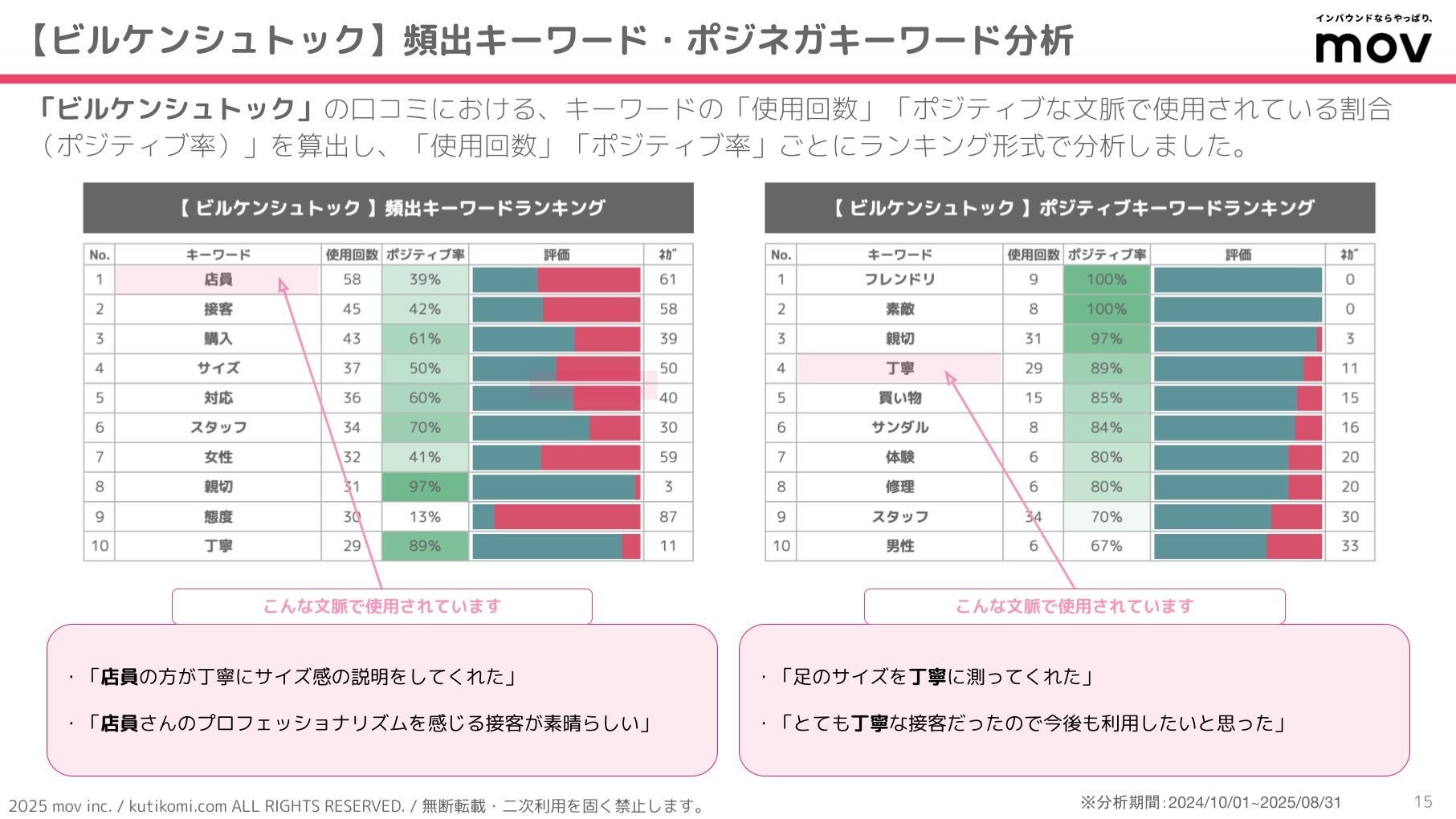 こちらの表では「ビルケンシュトック」の口コミにおける、キーワードの「使用回数」「ポジティブな文脈で使用されている割合(ポジティブ率)」を算出し、「使用回数」「ポジティブ率」ごとにランキング形式で分析しています。