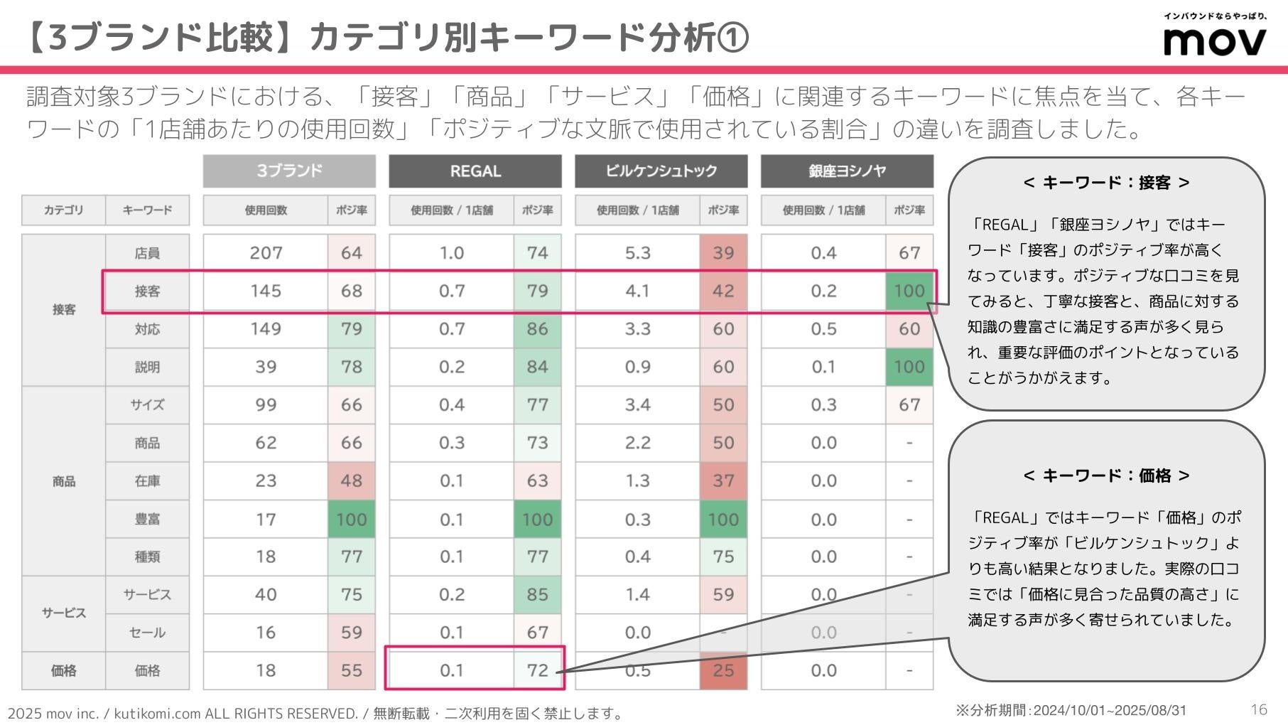 こちらの表では、調査対象3ブランドにおける「接客」「商品」「サービス」「価格」に関連するキーワードに焦点を当て、各キーワードの「1店舗あたりの使用回数」「ポジティブな文脈で使用されている割合」の違いを調査しています。