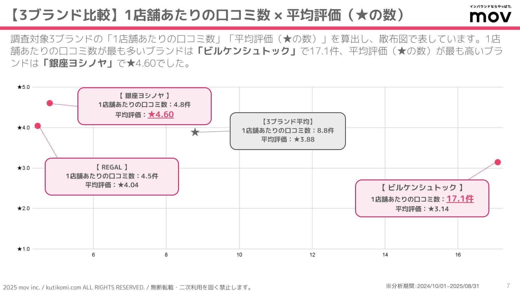 こちらの散布図では、調査対象3ブランドの「1店舗あたりの口コミ数」「平均評価(★の数)」を算出しています。1店舗あたりの口コミ数が最も多いブランドは「ビルケンシュトック」で17.1件、平均評価(★の数)が最も高いブランドは「銀座ヨシノヤ」で★4.60でした。