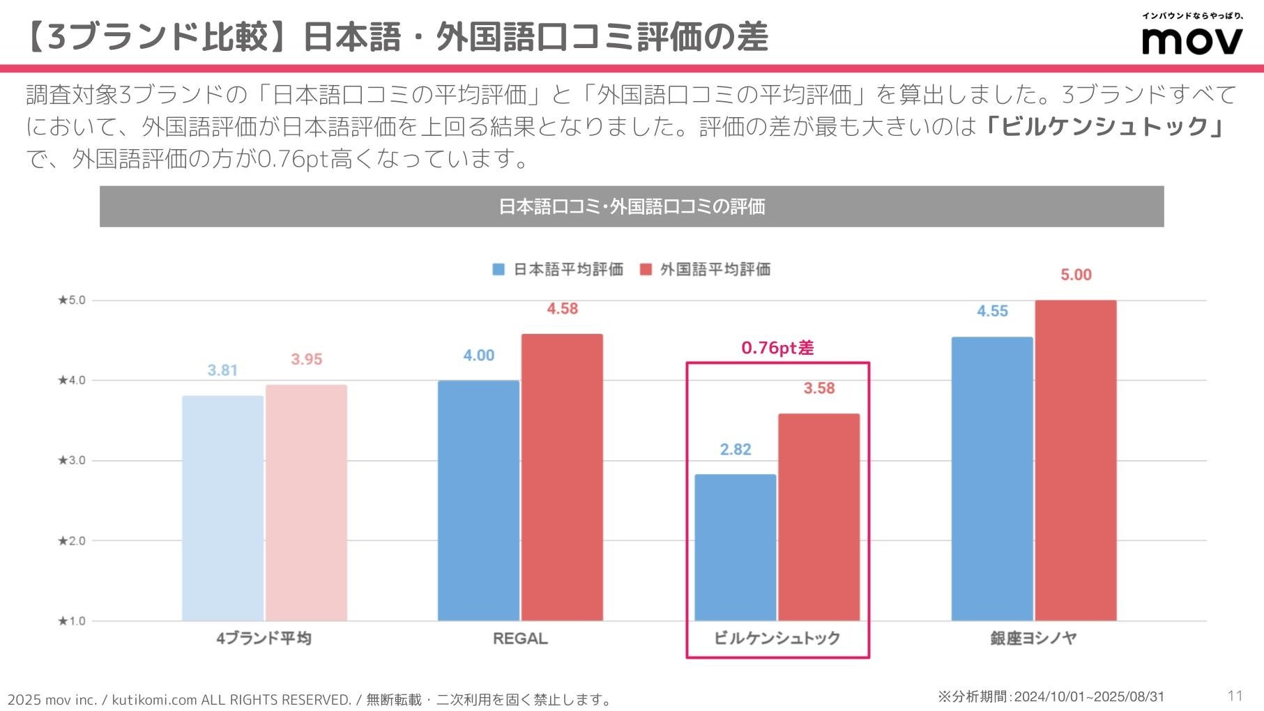 こちらのグラフでは、調査対象3ブランドの「日本語口コミの平均評価」と「外国語口コミの平均評価」を算出しています。3ブランドすべてにおいて、外国語評価が日本語評価を上回る結果となりました。評価の差が最も大きいのは「ビルケンシュトック」で、外国語評価の方が0.76pt高くなっています。