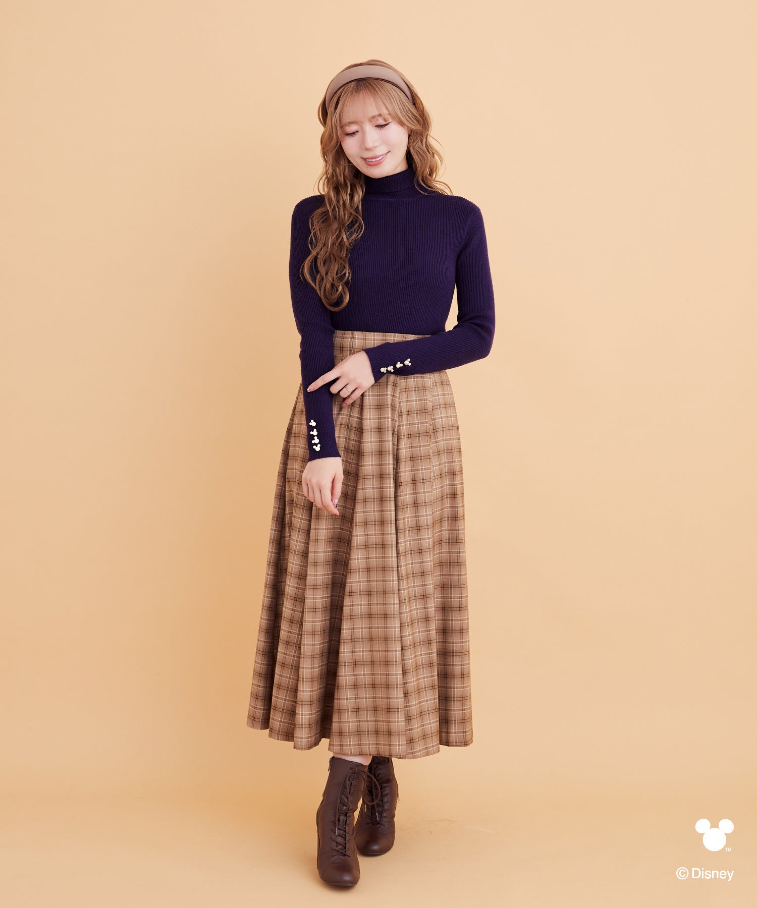 レトロなチェック柄が目を惹くジャンパースカートには、「ミッキーシェイプ」のパールボタンを施し、上品さをプラス。また、ジャンパースカートとお揃いのパールボタンを袖口に取り入れた、毎年人気のリブタートルネックニットもご用意しております。