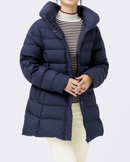 【ポイント】軽くて暖かいフレンチダックダウンを使用。ウエストを絞ったすっきりとしたシルエットでスタイル良く見せつつ、ボリュームのある襟が首元を暖かく包みます。