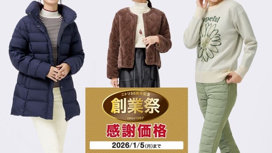 ニトリグループのアパレルブランド「N+」(エヌプラス)を展開する株式会社Nプラス(本社:東京都北区 代表取締役社長:高橋陵)は、2025年11月28日(金)から2026年1月5日(月)までの期間、ニトリ グループの一員として「ニトリ58周年記念創業祭」を開催します。 皆様のご支援とご愛顧への感謝の気持ちをこめて、冬に大活躍するアイテムを感謝価格でご提供させていただきます。ぜひ、N+ 店舗やニトリネットなどにお越しください。