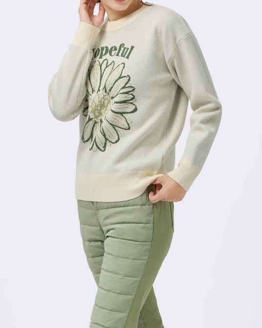 線描きタッチの花柄をジャカードで入れたプルオーバーニット。シックになりがちな冬のスタイルに華やぎをプラスしてくれるアイテムです。