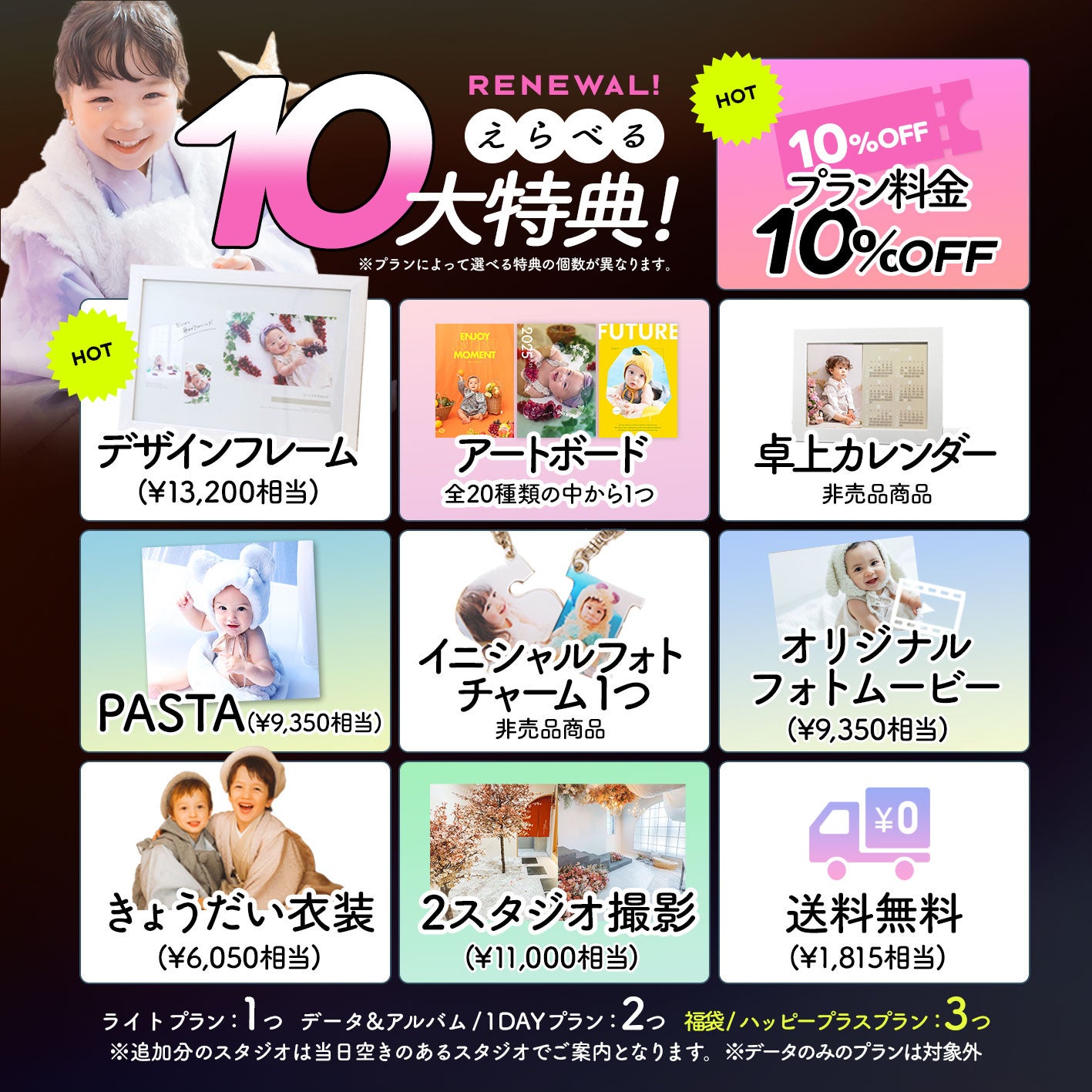 ご契約プランに応じて、10種類の特典から最大3つまで選択可能。ライトプランは1つ、データ&アルバムプランなどは2つ、最上位プランでは3つと、ご家族の予算と残したい形に合わせて柔軟に対応します。