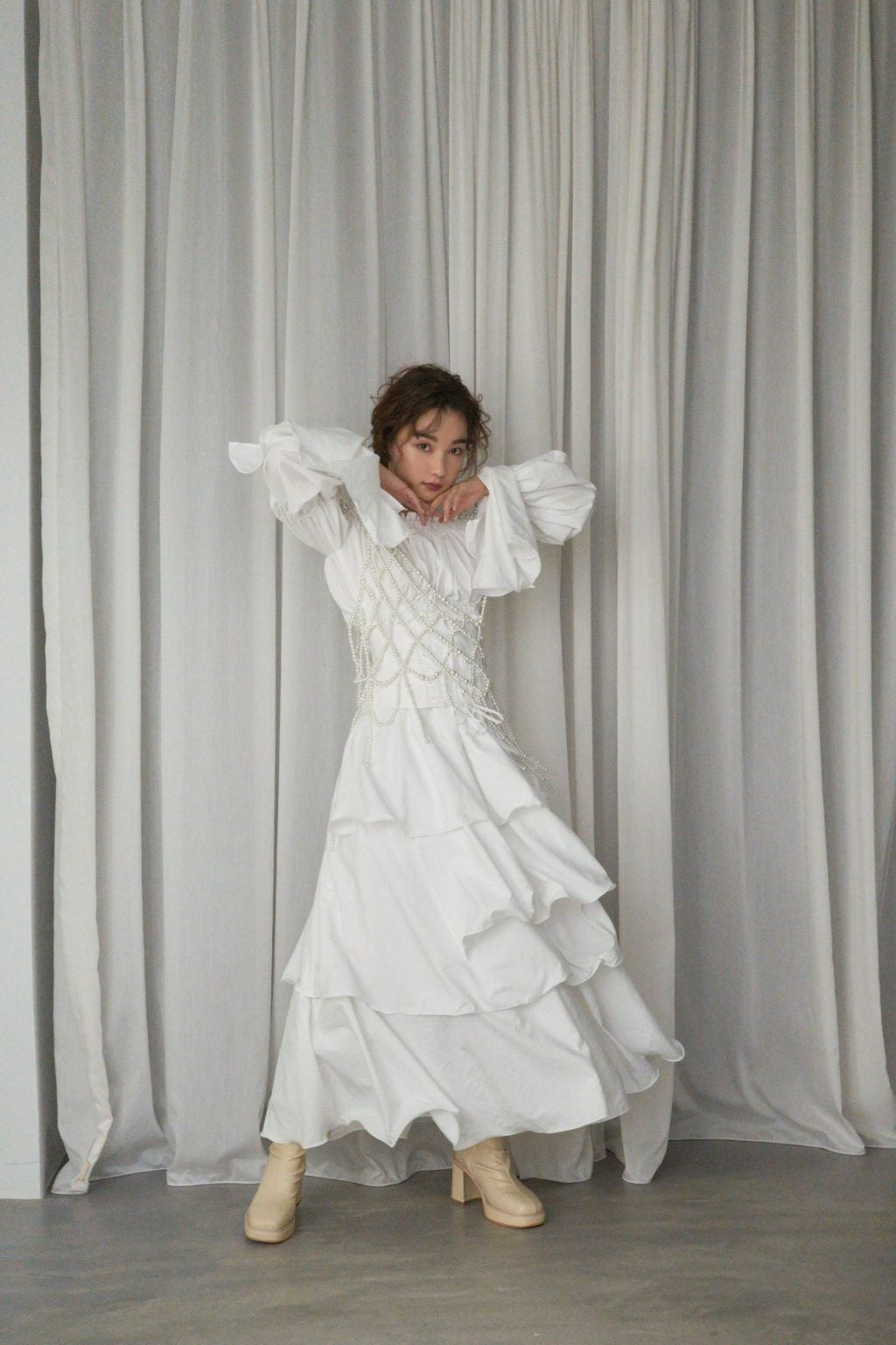 ワンピースシルエットのホワイトドレス。スリーブとスカートそれぞれに繊細な細工が施されたこだわりの一着に。肩にはパールのアイテムを付けることでシンプルなホワイト生地で出来たドレスにアクセントをプラス。誰でもお洒落に着こなすことが出来る世界に一つだけのワンピースドレスです。
