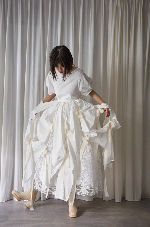 短冊状になっているスカートをランダムにリボンで結び隙間から贅沢なコードレースがちらりと見えるデザイン。背中もシンプルになりすぎない様に開きを作りレースを忍ばせています。カジュアルに見せるために肩ではなく袖口にボリューム感をだし、可愛らしさもありつつ大人な印象のドレスとなっております。